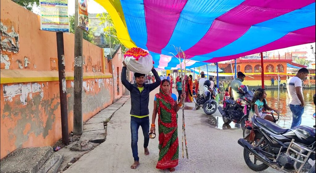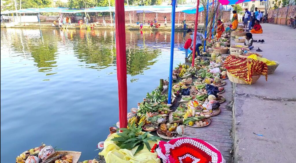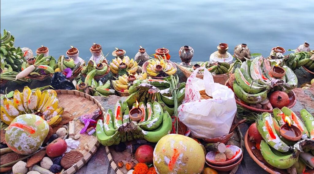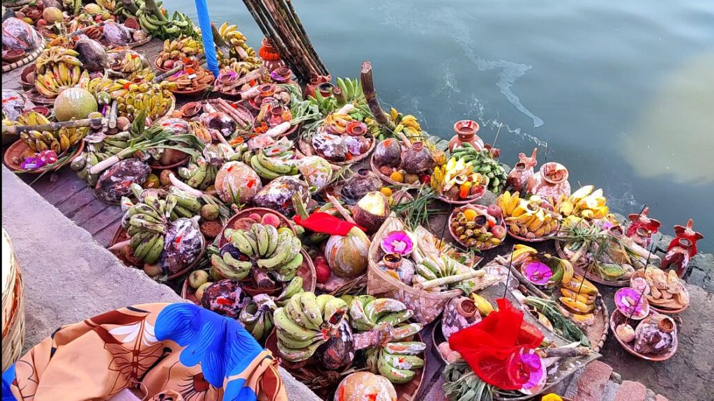 स्थानिय रुपमै माटोले बनाइएको माटोको नयाँ घैलो, हाँथी, कोसिया कुरबार, बाँसले बनाइएको कोलसुप, सुपा, ढकिया, चंगेरासहितमा प्रसाद राखि जम्मा भएका ब्रतालुहरुले जलाशयको दृश्य मनमोहक बनाइएको हुन्छ । अस्ताउदो सुर्यलाई अघ्र्य दिदा व्रतीहरु दुवै हातमा चालमको घोल र सिन्दुर लगाएर अक्षत र फुल सहित पालैपालो अर्घ सामग्री सूर्यदेवता समक्ष अर्पण गरिन्छ ।