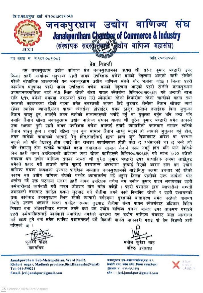 जउनपा ५ स्थित संजय पायल ज्वेलर्समा करिव सावा छ बजे धनुषाका प्रहरी नायव निरिक्षक गणेश बम नेतृत्वको टोली पुगेर तिजोरीमा रहेको चाँदी र काउन्टरको गर गहना लिएर जान खोज्दा पसले संजय ठाकुर र तुरुन्तै पुगेको संघका अध्यक्ष भण्डारीले छापा हान्न कुन निकायको आदेश वा पत्राचार भएको हो बुझन खोजेको र प्रहरीले नमानेपछि लैजान लागेको गरगहना मुचुल्का गरेर मात्र लैजान दिने व्यापारीहरुको अडान पछि प्रहरीद्वारा सांघातिक आक्रमण गरिएको आरोप विज्ञप्तीमा लगाएको छ ।