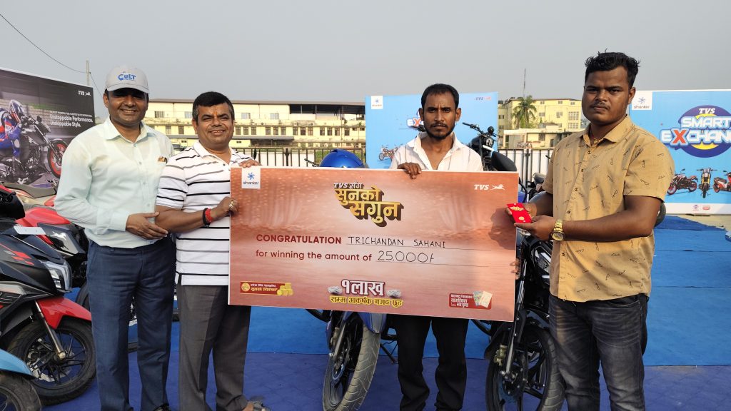 यस अघि टिभिएसकै सुनको सगुन अफर अन्तर्गत सुनको सिक्का जित्ने विजेतालाई पुरस्कार प्रदान गरिएको छ । गत फागुन महिनामा टिभिएसको बाइक लिएका नगराइन नगरपालिका ८ खिरखिरियाका मिन्टु यादवलाई पुरस्कार प्रदान गरिएको थियो । त्यस्तै मेला अन्तर्गत टिभिएसको अपाचे बाइक किनेका जनकपुरधाम २४ बसहियाका त्रीचन्दन सहनीले प्राप्त गरेका २५ हजार छुट रकमको चेक समेत हस्तान्तरण गरिएको आर्यन अटो मोबाइल्सका संचालक महतोले बताए ।