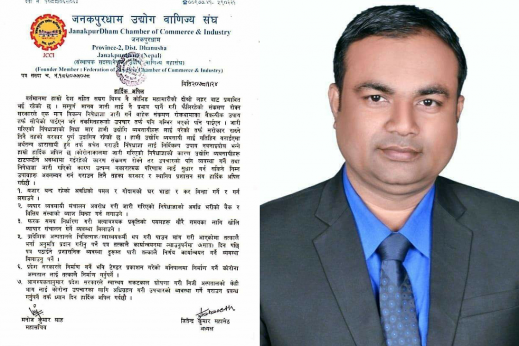 अध्यक्ष जितेन्द्र महासेठ र महासचिव मनोज कुमार साहद्वारा जारी विज्ञप्तीमा अति आवश्यक प्रकृतीका पसलहरु सुरक्षा सतर्कता सहित खोल्न वातावरण बनाउने, जनकपुरधाम प्रादेशिक अस्पतालमा अपुग रहेको दरबन्दी अतिसिघ्र पदपुर्ती गर्न गराउन दबाद दिने, मनिपाल अस्पताललाई विलम्व नगरि तुरन्त कोभिड अस्पतालको रुपमा सञ्चालनमा ल्याउनु पर्ने र प्रदेश सरकारले स्वास्थ्य संकटकाल घोषणा गरि निजि अस्पतालको केहि भागमा कोभिड सेवा सुरु गर्न गराउन पहलकदमी लिनु पर्ने विज्ञप्तीमा उल्लेख छ ।
