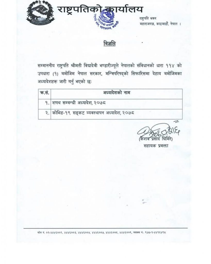 राष्ट्रपति भण्डारीले बिहीबार नै कोभिड–१९ संकट व्यवस्थापन अध्यादेश २०७८ पनि जारी गरेकी छन् ।