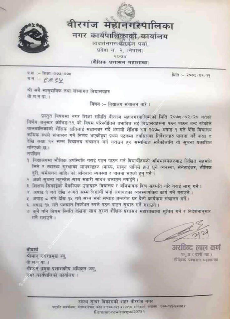 पर्सा, जेठ २२ः वीरगञ्ज महानगरपालिकाले असार १ गतेदेखि क्रमिकरुपमा विद्यालय खोल्ने निर्णय गरेको छ । महानगरपालिकाले असार १ गतेदेखि विद्यार्थीको उपस्थितिमै कक्षा ८ देखि १२ सम्म कक्षा सञ्चालन गर्न लागेको हो । बालबालिकाको शैक्षिक क्षतिलाई मध्यनजर गर्दै क्रमिकरुपमा विद्यालय सञ्चालन गर्न लागिएको महानगरपालिकाको तर्क छ । शैक्षिक प्रशासन महाशाखाका प्रमुख अरविन्द लाल कर्णले सबै सामुदायिक तथा संस्थागत विद्यालयहरुमा पत्राचार गर्दै असार १ गतेदेखि विद्यालय सञ्चालन गर्न आह्वान गरेका छन् ।