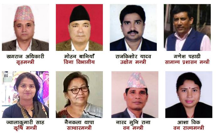 त्यस्तै, कृषि मन्त्रीमा ज्वालाकुमारी साह, उद्योगमा राजकिशोर यादव, वन राज्यमन्त्रीमा आशा विक र मोहन बाँनिया विना बिभागिय मन्त्री बनेका छन् । नयाँ मन्त्रीहरुको सपथ कार्यक्रम दिउँसो ४ बजे राखिएको छ । प्रधानमन्त्री ओलीले हाल उद्योग, वाणिज्य तथा आपूर्ति, कृषि तथा पशुपंक्षी विकास, रक्षा, गृह, वन तथा वातावरण, सङ्घीय मामिला तथा सामान्य प्रशासन, सञ्चार तथा सूचना प्रविधि मन्त्रालय आफैं सम्हाल्दै आएका छन् ।