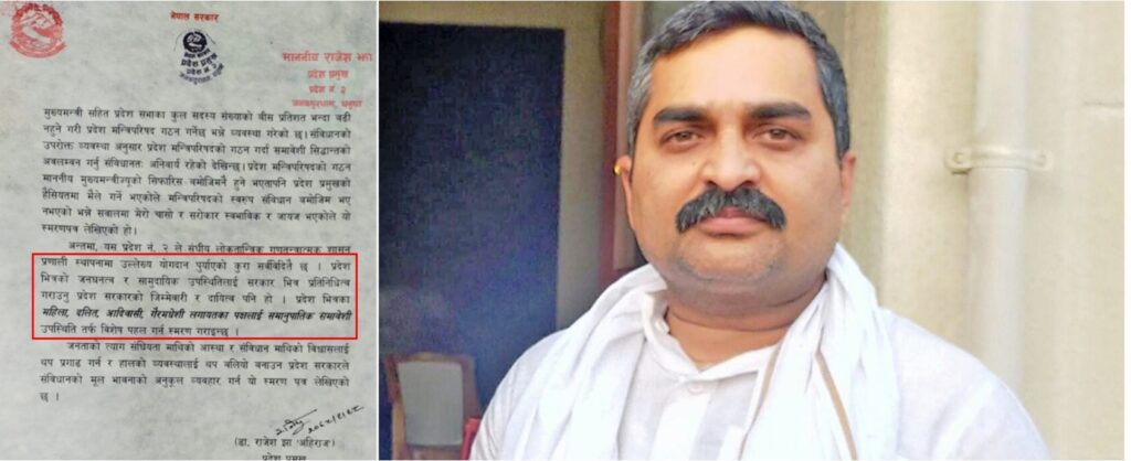 ‘प्रदेशभित्रका महिला, दलित, आदिवासी, गैरमधेसीलगायतका पक्षलाई समानुपातिक, समावेशी उपस्थितितर्फ विशेष पहल गर्न स्मरण गराइन्छ,’ उनले पत्रमा लेखेका छन् । पुनर्गठिन मन्त्रिपरिषद्मा महिलालाई मन्त्री नबनाएको भन्दै एमालेले पनि प्रश्न उठाएको छ ।