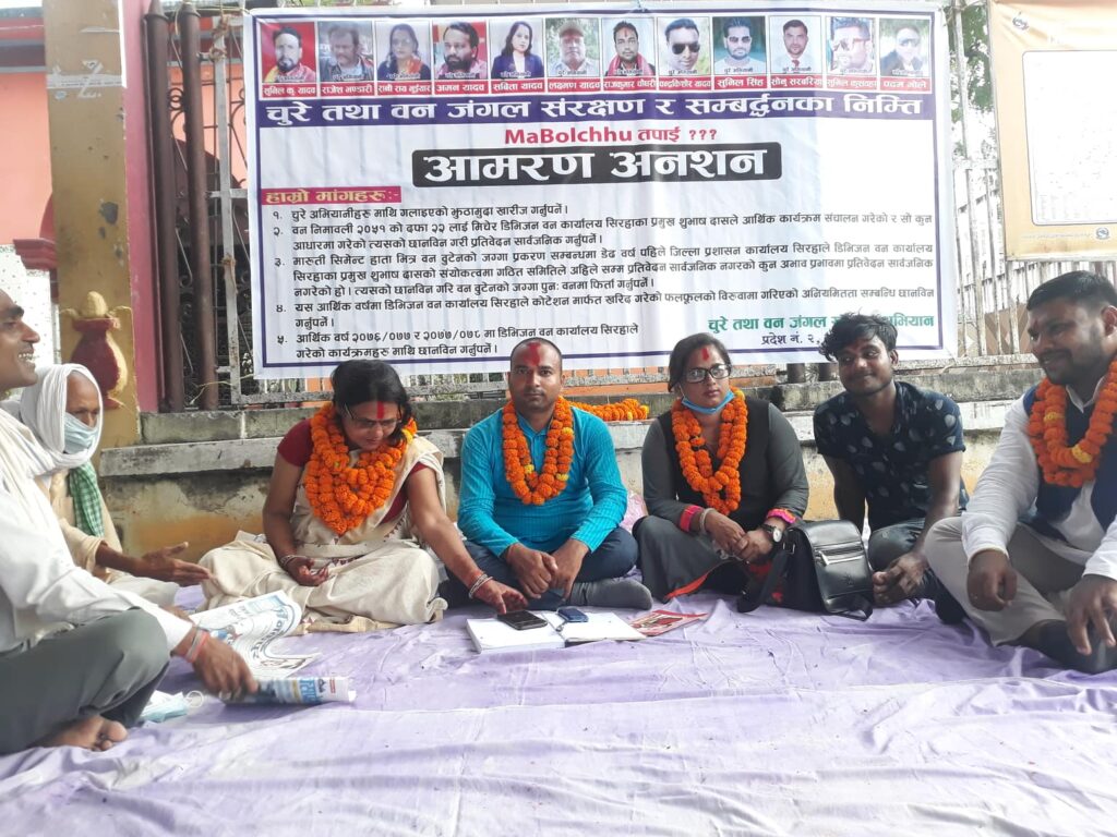 जनकपुरधाम, साउन २८ : चुरे तथा वन जंगल संरक्षण अभियानीहरु आजदेखि आमरण अनशनमा बसेका छन् । सिरहास्थित मारुती सिमेन्टले कब्जा गरेको वन बुटेको जग्गा फिर्ता हुनुपर्नेलगायत विभिन्न पाँचबुँदे माग राख्दै अभियानीहरु जनकपुरधामस्थित जनकचोकमा आमरण अनशनमा बसेका हुन् ।