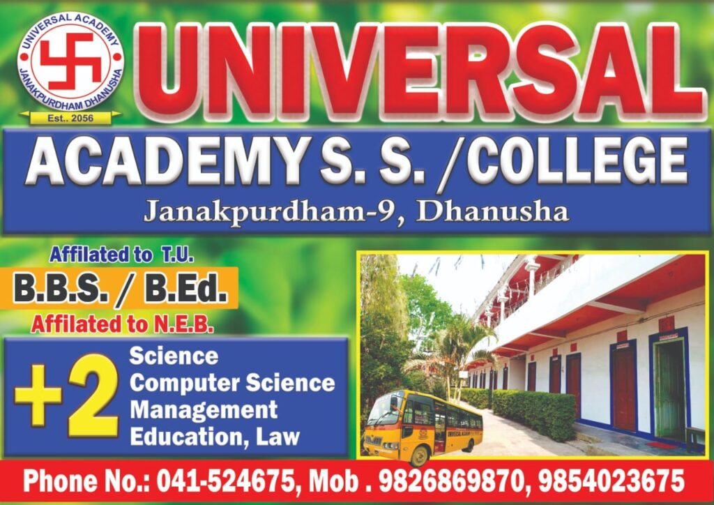 जनकपुरधाम, भदौ २४ : जनकपुरधामको युनिभर्सल एकेडमी कलेजले धनुषाको लक्ष्मीनियाँ गाँउपालिकाको सातवटै वडाका एक छात्र र एक छात्रालाई छात्रवृतीमा प्लस टु पढाउने घोषणा गरेको छ ।