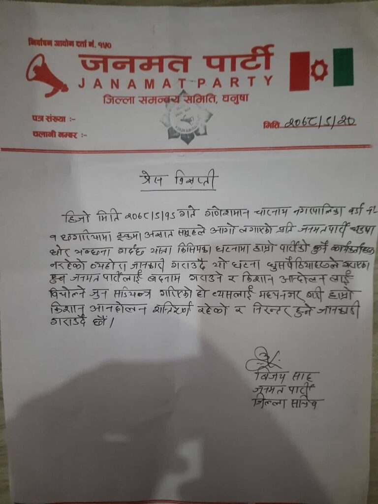 विज्ञप्तीमा भनिएको छ, ‘यस्ता घटनामा हाम्रो कुनै पनि कार्यक्रताको सहभागिता छैन, घुसपैठियाहरुले घटना गराएर जनमत पार्टीलाई बदनाम गर्ने र किसान आन्दोलनलाई दबाउने षडयन्त्र गरेको हाम्रो ठहर छ ।’ किसान आन्दोलन शान्तिपुर्ण र निरन्तर जारी रहने समेत बताइएको छ ।