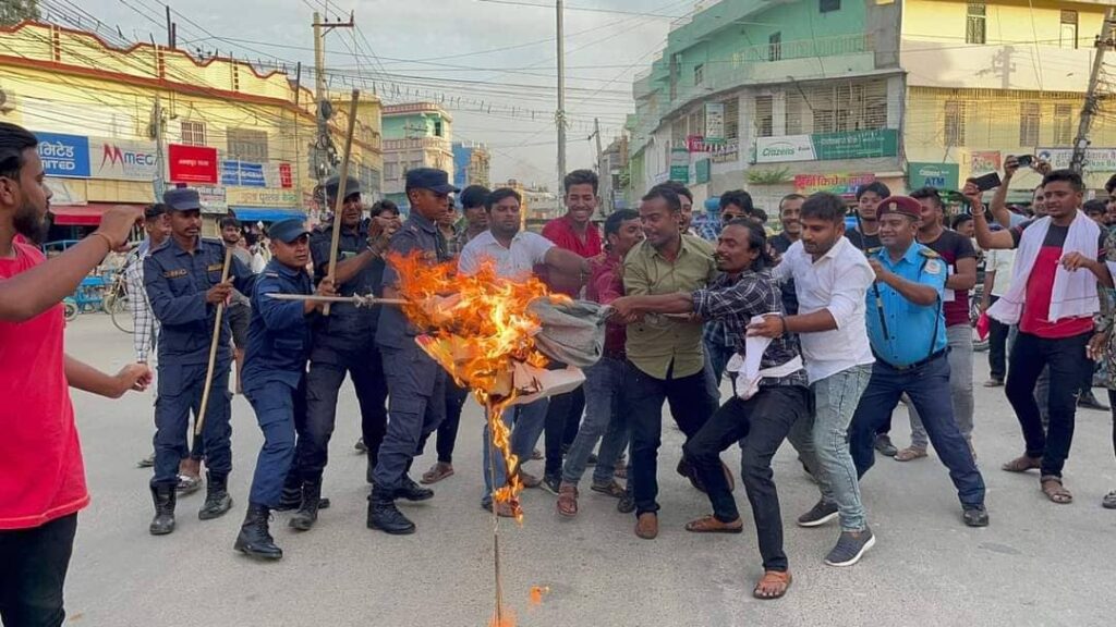जनकपुरधाम, जेठ १२ : पेट्रोलियम पदार्थ तथा खाना पकाउने ग्याँसमा भइरहेको मूल्यवृद्धिको विरोध गर्दै जनकपुरधाममा सत्तारुढ पाँचदलीय गठबन्धनका नेताहरुको पुत्ला जलाइएको छ । स्थानीय भानूचोकमा लोकतान्त्रिक समाजवादी पार्टी निकट लोसपा युवा संघ र लोसपा विद्यार्थी संघको आयोजनामा बिच सडकमै पुत्ला जलाइएको हो ।