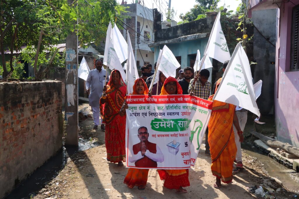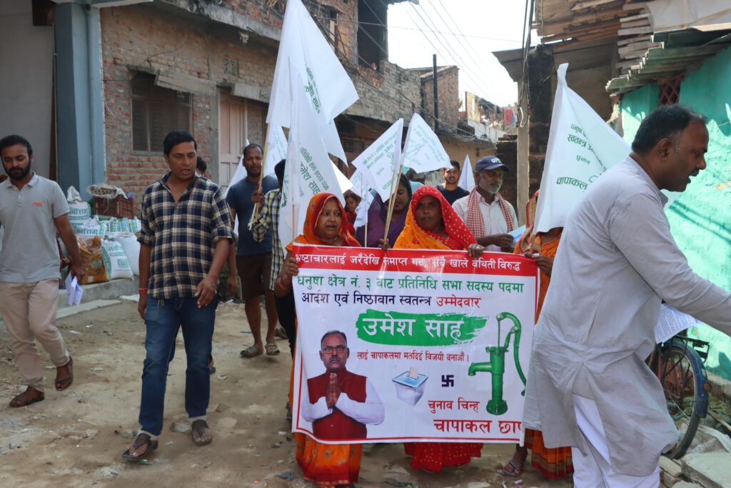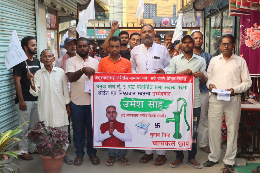 जनकपुरधाम, कार्तिक १ : पछि पछि हातमा ब्यानर सहित सहयोगी अघि अघि उम्मेदवार आफै पर्चा घरघरमा बाटदै हिडिरहेका हुन्छन् । म जनकपुरधामको मुलवासी हुँ, उनी भन्छन ‘म विकल्प किन हुन सक्दिन ।’ चापाकल चुनाव चिन्ह पाएका धनुषा निर्वाचन क्षेत्र नं. ३ का प्रतिनिधिसभा तर्फको स्वतन्त्र उम्मेदवार उमेश साहको तर्क हो यो ।