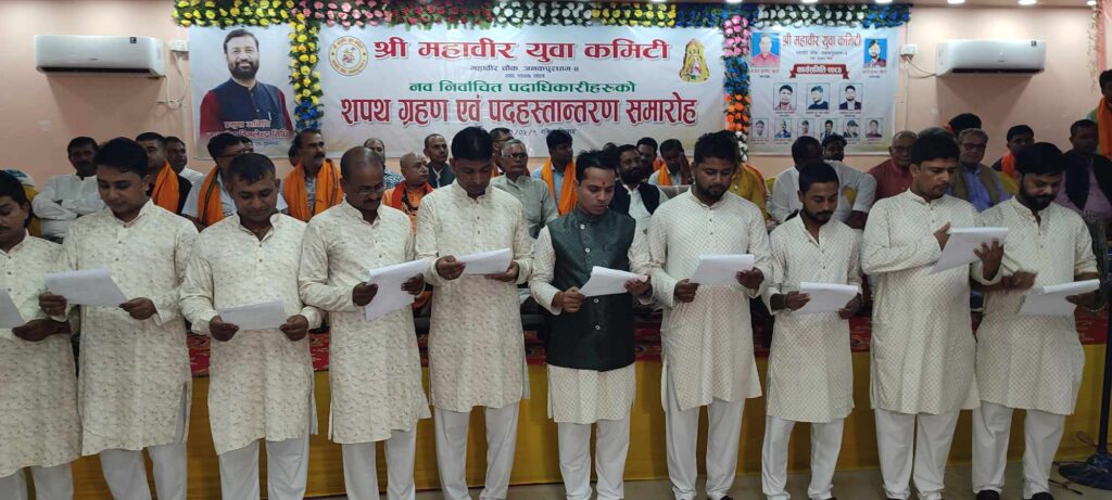 जनकपुरधाम, भदौ ९ : जनकपुरधामको श्री महाविर युवा किमिटिको नवनिर्वाचित कार्यसमितिका अध्यक्ष अजय गुप्ता सहित पदाधिकारी तथा सदस्यहरुले पदभार ग्रहण गरेका छन् । शनिवार आयोजित कमिटिको पदभार तथा सपथग्रहण र प्रमाणपत्र वितरण समारोहमा निर्वाचन अधिकृत राकेश विक्रम साहले कमिटिको नव निर्वाचित अध्यक्ष गुप्ता सहित ११ सदस्सीय नयाँ कार्यसमितिका पदाधिकारी र सदस्यहरुलाई सपथग्रहण गराएका छन् ।