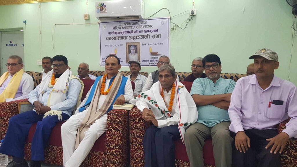 जनकपुरधाम, असोज २० : वरिष्ठ पत्रकार, साहित्यकार तथा प्रेस स्वतन्त्रता सेनानी स्व. राजेश्वर नेपालीको स्मरण कविताका माध्यमले गरिएको छ । नेपाल पत्रकार महासंघ धनुषाको सभाहलमा मैथिली साहित्यकारसभा जनकपुरधामको आयोजनामा स्व. नेपालीको स्मरणमा भएको काव्यात्मक श्रद्धाञ्जलीसभामा धनुषाका कविहरुले आफना कविताका माध्यमले स्व. नेपालीको विशेषता बर्णन गरेका थिए ।