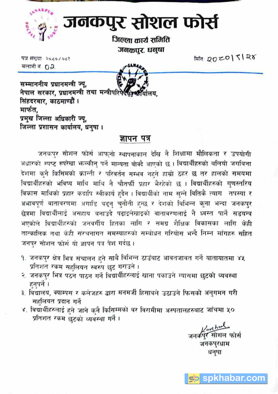 जनकपुरधाम, पुस २४ : जनकपुर सोशल फोर्सले विभिन्न ४ बुन्दे माग राख्दै जिल्ला प्रशासन कार्यालय धनुषामा ज्ञापन पत्र बुझाएको छ । पछिल्लो समय विद्यार्थीहरुको भविश्यसंग खेलवाड भईरहेकाले आफूहरु बाध्य भएर विभिन्न माग राख्दै जिल्ला प्रशासन कार्यालय मार्फत प्रधानमन्त्रीसमक्ष विभिन्न माग राख्दै ज्ञापन पत्र बुझाएको फोर्सका रोशन साहले जानकारी दिए ।