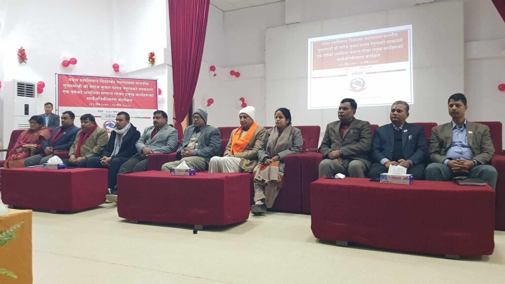 जनकपुरधाम, माघ ३ : मधेश प्रदेशका मुख्यमन्त्री सरोज कुमार यादवले आफनो एक वर्षे कार्यकालको प्रगती विवरण भन्दै १७ पृष्ठ लामो प्रतिवेदन सार्वजानिक गरेको छ । मधेशमा आधा घण्टै पिच्छे स्तरीय जिल्ला अस्पताल सहितको स्वास्थ्य सेवा देखि शिक्षा, समाजिक, पुर्वाधार, सञ्चार र सुरक्षा सहितका विभिन्न पक्षमा सफलता झल्किने एक वर्षे कार्यप्रगती विवरण मुख्यमन्त्री यादवले मधेश प्रदेश घोषणा भएको दिन माघ ३ लाई मधेश स्वाभिमान दिवसका रुपमा मनाउदै सार्वजानिक गरेको हो ।