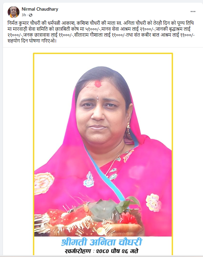चौधरीकी धर्मपत्नी तथा उनका दुई सन्तान आकाश र कशिश चौधरीकी ममतामयी माता स्व. अनिता चौधरीको १३ औं दिनको पूण्य तिथिमा चौधरी परिवारले मारवाड़ी सेवा समितिको छात्रवृति कोषमा ५१०००/–,मानव सेवा आश्रमलाई २१०००/–,जानकी बृद्धाश्रमलाई २१०००/–,जनक छात्रावास लाई ११०००/–,सीताराम गौशालालाई ११०००/– तथा संत कबीर बाल आश्रमलाई ११०००/–सहयोग दान गर्ने घोषणा गरेको हो ।