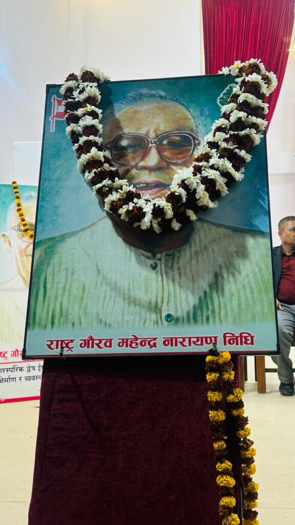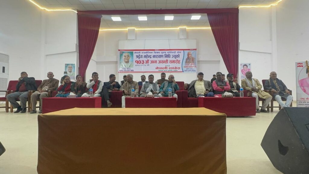 जनकपुरधाम, फागुन १२ : गान्धीवादी नेता भनेर समेत चिनिने नेपाली कांग्रेसका संस्थापक मध्येका नेता स्व. महेन्द्र नारायण निधीको १०३ औं जन्म जयन्ती वहाँको पैतृक शहर जनकपुरधाममा पनि मनाइएको छ । नेपाली कांग्रेस धनुषाको आयोजनामा वहाँकै नामवाट स्थापित महेन्द्र नारायण निधी मिथिला सांस्कृतीक केन्द्रमा ओयोजित एक समारोहमा वक्ताहरुले नेपाली कांग्रेस आफना अभिभावकहरुको अनुहार मात्र होइन बिचार र सिद्वान्त पनि बिर्सदै जानुनै पार्टीको कमजोर हुनुको कारण रहेको बताए ।