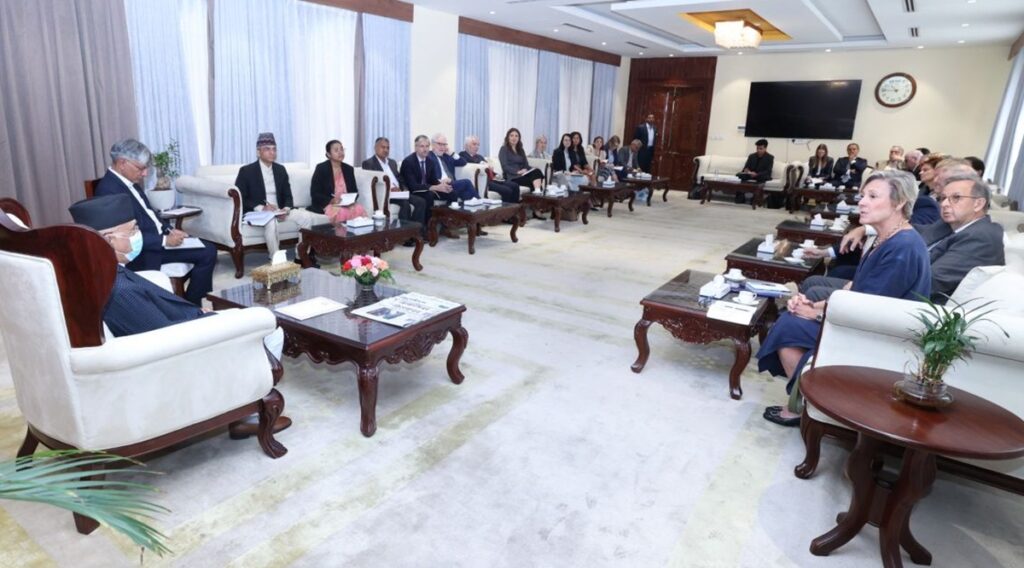 प्रधानमन्त्री निवास बालुवाटारमा भएको भेटमा नेपालका लागि युरोपियन युनियनका राजदूत भेरोनिक लोरेन्जोसहित काठमाडौंस्थित राजदूत र भारतको नयाँ दिल्लीस्थित गैरआवासीय राजदूतहरूको उपस्थिति थियो । यही जेठ २ देखि ४ गतेसम्म काठमाडौंमा सम्पन्न सगरमाथा संवादका लागि पहिलोपटक युरोपियन युनियनका यति धेरै राजदूतहरू एकै पटक नेपाल आएका हुन् ।भेटका अवसरमा नेपाल र युरोपियन युनियनबीचको ५१ वर्षदेखिको कूटनीतिक सम्बन्धको स्मरणसहित नेपालको स्थायित्व, आर्थिक विकास, सुशासनका लागि सहकार्यका विषयमा विमर्श भएको थियो ।प्रधानमन्त्री ओलीले नेपालले सशस्त्र द्वन्द्व, शान्तिपूर्ण जनआन्दोलन र शान्ति वार्ताका चरण हुँदै संविधानसभाबाट नयाँ संविधान जारी गरेपछि आर्थिक विकास र सुशासनका क्षेत्रमा गति लिएको अवगत गराए । उनले मुलुकको राजनीतिक परिवर्तनमा लागेका दुई ठूला दलहरू नेकपा एमाले र नेपाली कांग्रेस मिलेर आर्थिक विकास र सुशासनको प्रतिबद्धतासहित सरकार गठन भएकाले नेपालको समृद्धि र रोजगारी सृजनाका लागि लगानी विस्तार गर्न आग्रह गरे ।प्रधानमन्त्री ओलीले जनताको सङ्घर्षबाट प्राप्त सङ्घीय लोकतान्त्रिक गणतन्त्रात्मक व्यवस्थाबाट पछाडि फर्कने कुनै सम्भावना नरहेकाले अबको गन्तव्य नेपालको स्थायित्व र समृद्धि रहेको स्पष्ट पारे ।‘सबैसँग मित्रता, छैन कसैसँग शत्रुता’ भन्ने भावलाई आत्मसात् गर्दै नेपालको भारत र चीन दुवै छिमेकीसँग नजिकको सम्बन्ध रहने र अन्य मुलुकसँग मित्रवत् सम्बन्ध रहने स्पष्ट पारे । उनले सगरमाथा संवादको पहिलो शृङ्खलामा सहभागिताका लागि सबैलाई धन्यवाद दिँदै हिमालदेखि समुद्रसम्मको अवधारणालाई महत्त्व दिँदै यस शृङ्खलाको निरन्तरता हुने बताए ।प्रधानमन्त्री ओलीले सङ्क्रमणकालीन न्यायसम्बन्धी कानून निर्माण भई सम्बद्ध पक्षको परामर्शसमेतका आधारमा दुई आयोग गठन भएकाले अब काममा ढिलाइ नहुने स्पष्ट पारे ।युरोपियन युनियनका राजदूतहरूले नेपालको आर्थिक–सामाजिक विकासका प्रयासमा साथ दिँदै शिक्षा, पूर्वाधार, स्वास्थ्य, हरित ऊर्जा, सूचना प्रविधि र जलवायु परिवर्तनका क्षेत्रमा सहयोगको निरन्तर हुने बताएका थिए ।उनीहरूले नेपालले सङ्क्रमणकालीन न्यायलाई अन्तिम टुङ्गोमा लान थालेको खुसी व्यक्त गर्दै पीडितका मुद्दालाई केन्द्रमा राख्न आग्रह गरेका थिए । राजदूतहरूले सगरमाथा संवादको सफल आयोजनाका लागि नेपाललाई बधाई दिएका थिए ।