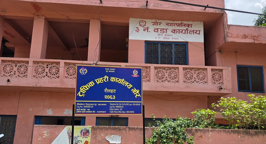 ट्राफिक प्रहरीले हाल आएर गौर नगरपालिका–३ कार्यालयको भुइँ तल्लामा बसेर सेवा दिँदै आएको जिल्ला ट्राफिक प्रहरी कार्यालय चन्द्रनिगाहपुरका प्रमुख प्रहरी निरीक्षक लोकेन्द्र अधिकारीले बताउनुभयो । कार्यालय सञ्चालन र वास बस्नका लागि गौर नगरपालिकाले एक हप्तादेखि वडा कार्यालय रहेको घरको भुइँ तल्लाको कोठा उपलब्ध गराएको जानकारी उहाँले दिनुभयो ।साविक डिभिजन सहकारी कार्यालयको भवनमा हाल गौर नगरपालिकाले–३ कार्यालय सञ्चालन गरी रहेको छ । बाहिरी आवरण रङरोगन गरेर चिटिक्क परेको भए पनि भित्रि भाग जीर्ण रहेको छ ।ट्राफिक प्रहरीले चेकजाँचको क्रममा नियम विपरीत सञ्चालन भएका सवारीसाधन, चोरीका सवारीसाधन समात्दा राख्ने ठाउँको समेत अभाव रहेको ट्राफिक प्रहरी कार्यालय गौरका प्रहरी सहायक निरीक्षक दिपेन्द्र झाको भनाइ छ ।भवन नहुँदा कार्यसम्पादनमा समेत समस्या भएको छ, कार्यालय भवन र बस्ने अभाव २०६३ सालदेखि ट्राफिक प्रहरी कार्यालय गौरले झेल्दै आइरहेको प्रहरी सहायक निरीक्षक झाले भन्नुभयो ।गौरमा ट्राफिक प्रहरी कार्यालय स्थापना भएदेखि तीन ठाउँमा कार्यालय सार्नु परेको प्रहरी सहायक निरीक्षक झाले बताउनुभयो ।जिल्ला हुलाक कार्यालयको भवनबाट सेवा दिइ रहेको कार्यालय अहिले आएर वडा कार्यालयमा सरेको छ । सामान्य वर्षा हुँदा समेत कोठामा पानी पस्ने ट्राफिक प्रहरीको पीडा यथावत रहेको छ । गौरमा नौ जना ट्राफिक प्रहरीको दरबन्दी रहेको जिल्ला ट्राफिक प्रहरी कार्यालय चन्द्रनिगाहपुरले जनाएको छ ।गौर नगरपालिकाले विगतका दिनमा जग्गा उपलब्ध गराउने प्रतिबद्धता गरे पनि हालसम्म कार्यान्वयन हुन् नसकेको जिल्ला ट्राफिक प्रहरी कार्यालय चन्द्रनिगाहपुरका प्रहरी निरीक्षक अधिकारिले बताउनुभयो ।भवन निर्माणको लागि आवश्यक पहल गरिरहेको प्रहरी निरीक्षक अधिकारीले जानकारी दिनुभयो ।