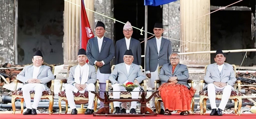 राष्ट्रपति कार्यालयको खण्डहर भवन बाहिर सोमबार नवनियुक्त तीन मन्त्रीहरूले शपथ ग्रहण गरेका छन् । प्रधानमन्त्री सुशीला कार्कीको उपस्थितिमा राष्ट्रपति रामचन्द्र पौडेलले मन्त्रीहरूलाई पद तथा गोपनीयताको शपथ दिलाएका हुन् ।