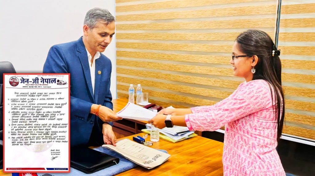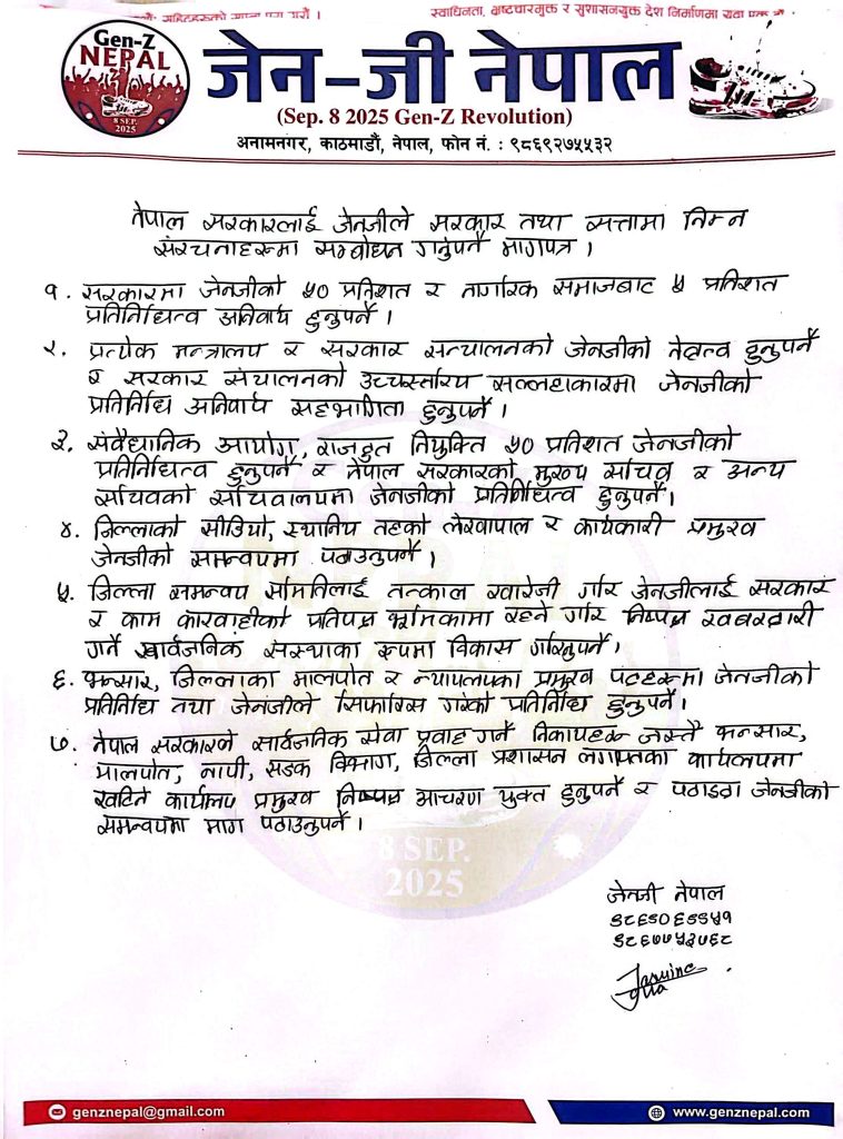 जेस्मिन ओझाको नेतृत्वमा गृहमन्त्री ओमप्रकाश अर्याललाई भेट्न पुगेका जेनजी प्रतिनिधिहरूले सात बुँदे प्रस्ताव राख्दै मन्त्रालयदेखि सरकार सञ्चालनसम्म जेनजीको नेतृत्व समावेश हुनुपर्ने अडान राखेका हुन्।