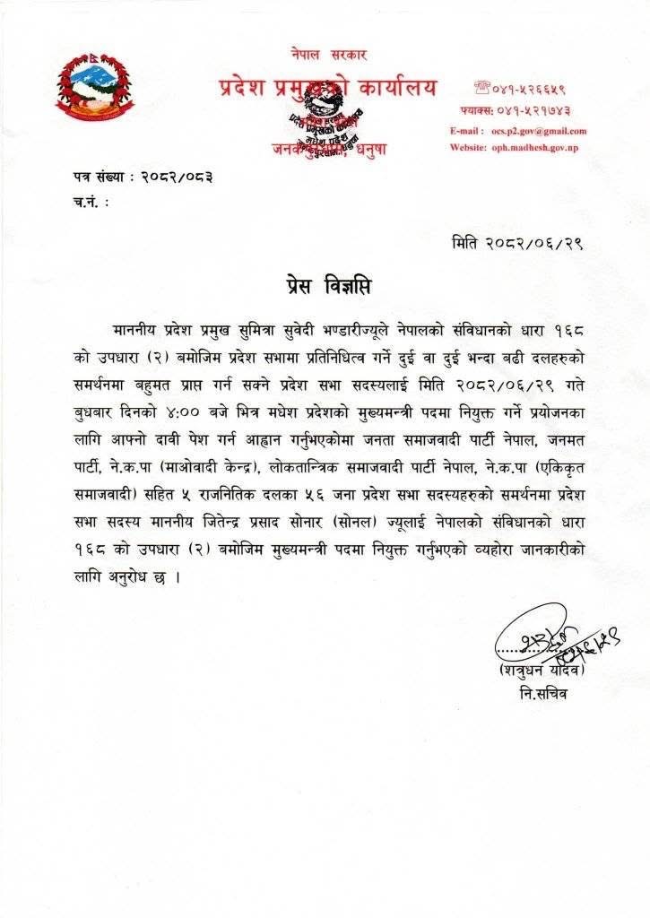 नयाँ नेतृत्वका लागि बुधवार बेलुकी चार बजे सम्म प्रदेश प्रमुख सुमित्रा सुवेदी भण्डारीले समयसिमा तोक्नु भएकोमा बुधवार बिहान कांग्रस एमाले बाहेकको ६ दलको ५७ सांसद सहित मुख्यमन्त्रीमा दावी पेश गरेका सोनललाई प्रदेश प्रमुख भण्डारीले संविधानको धारा १ सय ६८ को उपधारा २ बमोजिम नयाँ मुख्यमन्त्रीमा नियुक्त गर्नुभएको छ ।