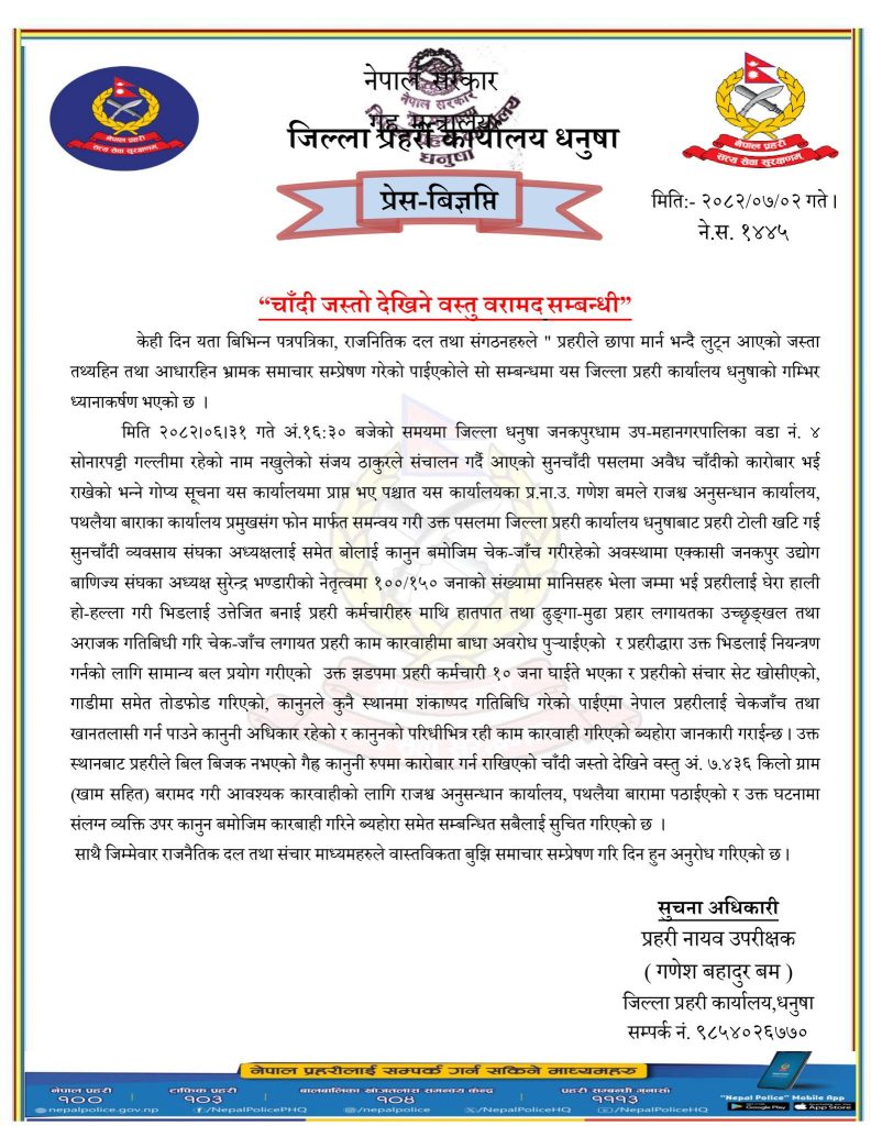 घटना पछि प्रहरीले बिना आधार, आदेश पत्र र सम्बन्धित निकायलाई जानकारी नै नगराई छापा मार्न पुगेको समाचार सञ्चार माध्यमहरुमा सम्प्रेशन भएको थियो । धनुषा प्रहरीको आलोचना हुन थालेपछि आइतवार प्रहरीले एक विज्ञप्ती जारी गर्दै सञ्चार माध्यम, राजनितिक दल र संघ संस्थाहरु माथि गलत भ्रम फैलाएको आरोप लगाएको छ ।