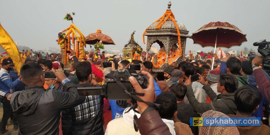 जनकपुरधाम, पुष ४ : जनकपुरधाममा प्रत्येक वर्ष मनाइने एतिहासिक श्री सिताराम विवाहपञ्चमी महामहोत्सवको मुख्य आकर्षण दुल्हा दुल्हिन सरकारको स्वयवंर शु–सम्पन्न भएको छ । सदाझै एतिहासिक बाह्रबिघ्घा रंगभुमि मैदानमा हजारौ हजार दर्शनार्थीहरु रामजानकीको स्वयवंरमा सरिक भएका छन् ।