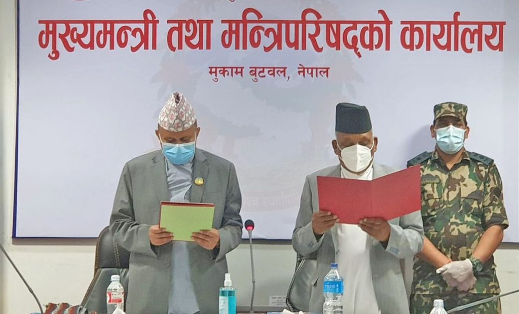 बुटवल, बैशाख १९ : लुम्बिनी प्रदेशको मुख्यमन्त्रीका रुपमा शंकर पोखरेलले शपथ लिएका छन् । पोखरेलका निजी सचिव तिरण गौतमले सामाजिक सञ्जालमार्फत यसबारे जानकारी दिएका हुन् । कांग्रेस माओवादीलगायत विपक्षी दलहरुको अवरोधका बीच उनले शपथ लिएका हुन् । पोखरेलले शपथ लिएसँगै चार मन्त्रीले पनि शपथ ग्रहण गरेका छन् ।