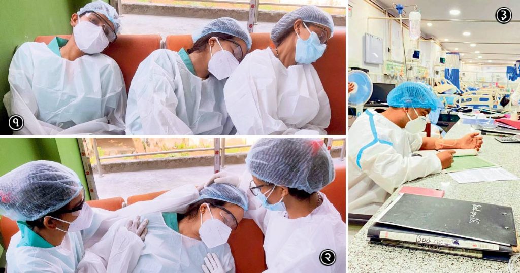 बाँकेको नेपालगन्जस्थित भेरी अस्पतालको कोेभिड विशेष वार्डमा रात्रिकालीन ड्युटीका क्रममा बेन्चमै झकाएका स्टाफ नर्सहरू प्रीति खड्का, कमला नेपाली र सुनीता सहकारी (१), लामो समय पीपीई लगाएपछि अप्ठ्यारो महसुस गरेकी स्टाफ नर्स प्रीति खड्कालाई स्याहार गर्दै स्टाफ नर्सहरू यमकुमारी थापा र निष्ठा पन्त (२) । यो अस्पतालका कर्मचारी र स्वास्थ्यकर्मी गरी ९० भन्दा बढी संक्रमित छन् । यही अस्पतालमा २ सय ९९ संक्रमित उपचाररत छन् । र, बाँकेकै नेपालगन्ज मेडिकल कलेजका डा. पुरुषोत्तम बर्मा आफैं कोरोनाबाट संक्रमित भई उपचाररत रहेको अवस्थामा कोभिड वार्डभित्र अन्य बिरामीको उपचारमा खटिँदै (३)। तस्बिर सौजन्य : डा.चन्द्रप्रकाश साहु र रुपन ज्ञवाली