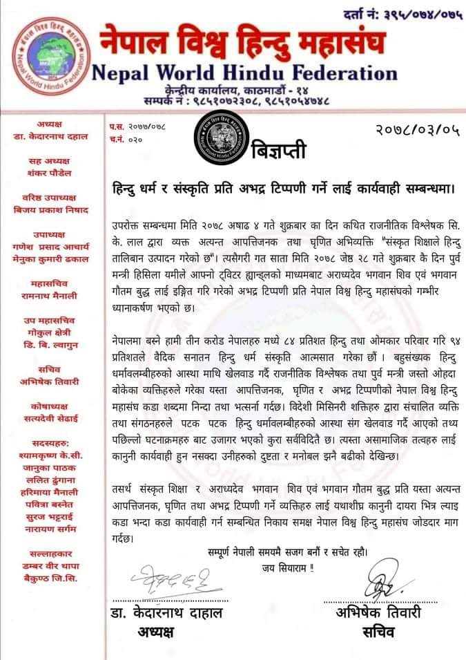 नेपाल विश्व हिन्दु महासंघको केन्द्रिय अध्यक्ष डा. केदारनाथ दाहाल र केन्द्रिय सचिव अभिषेक तिवारीद्वारा जारी संयुक्त बिज्ञप्तिमा नेपालमा बस्ने तीन करोड नेपालीहरु मध्ये ८४ प्रतिशत हिन्दु एवं ओमकार परिवार गरि ९४ प्रतिशतले वैदिक सनातन हिन्दु धर्म संस्कृति आत्मसात गरेको बहुसंख्यक हिन्दु धर्मावलम्बीहरुको आस्था माथि खेलवाड गर्दै राजनीतिक विश्लेषक तथा पूर्वमन्त्रीले गरेका यस्ता आपत्तिजनक, घृणित र अभद्र टिप्पणीको नेपाल विश्व हिन्दु महासंघ कडा शब्दमा निन्दा तथा भत्सर्ना गर्दछ विज्ञप्तीमा उल्लेख छ ।
