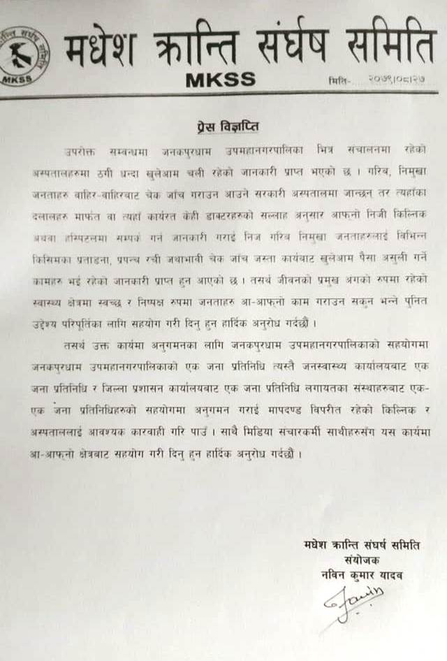 बाहिर बाहिर बाट उपचारका लागि जनकपुरधाम आउने गरिव, निमुख्खा जनताहरु सरकारी अस्पतालमा जाने गरेको भएपनि दलालहरु मार्फत उनीहरुलाई विभिन्न निजी अस्पतालमा पठाएर चर्को शुल्क असुल्ने देखि विभिन्न प्रताडना दिने काम भइरहेकाले समिति अप चुप लागेर नबस्ने विज्ञप्तीमा उल्लेख छ । मानव जिवनको मुख्य र सबै भन्दा संवेदनशिल स्वास्थ्यमा पनि भइरहेको लापरवाहीमा राज्य मौन हुनु दु:खद रहेको समितिको ठहर छ ।