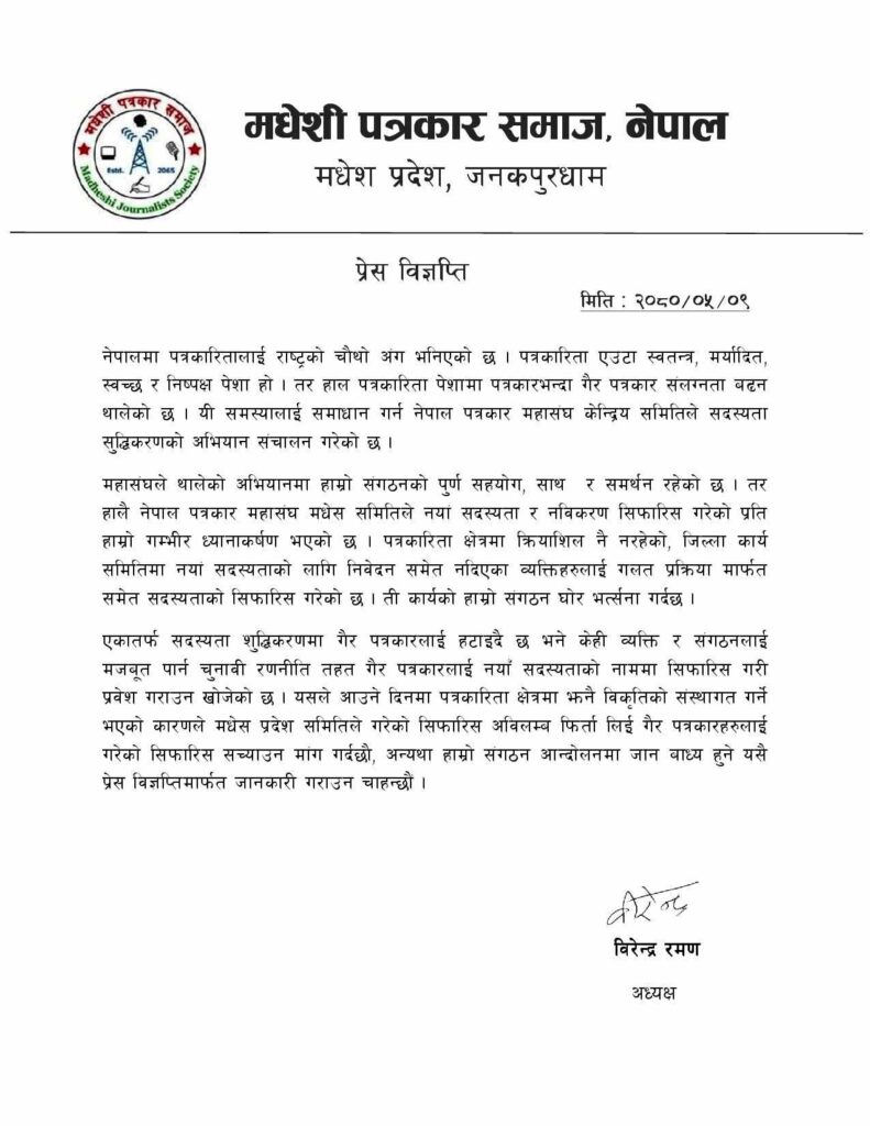 जनकपुरधाम, भदौ ९ : मधेशी पत्रकार समाजले नेपाल पत्रकार महासंघ मधेश प्रदेशको सदस्यता नविकरण र नयाँ सदस्यता सम्बन्धी सिफारिस प्रति आपती जनाएको छ । समाजका मधेश प्रदेश अध्यक्ष विरेन्द्र रमणद्वारा जारी विज्ञप्तीमा महासंघको प्रदेश समितिले गरेको सिफारिस आपतीजनक रहेको जनाएको छ ।