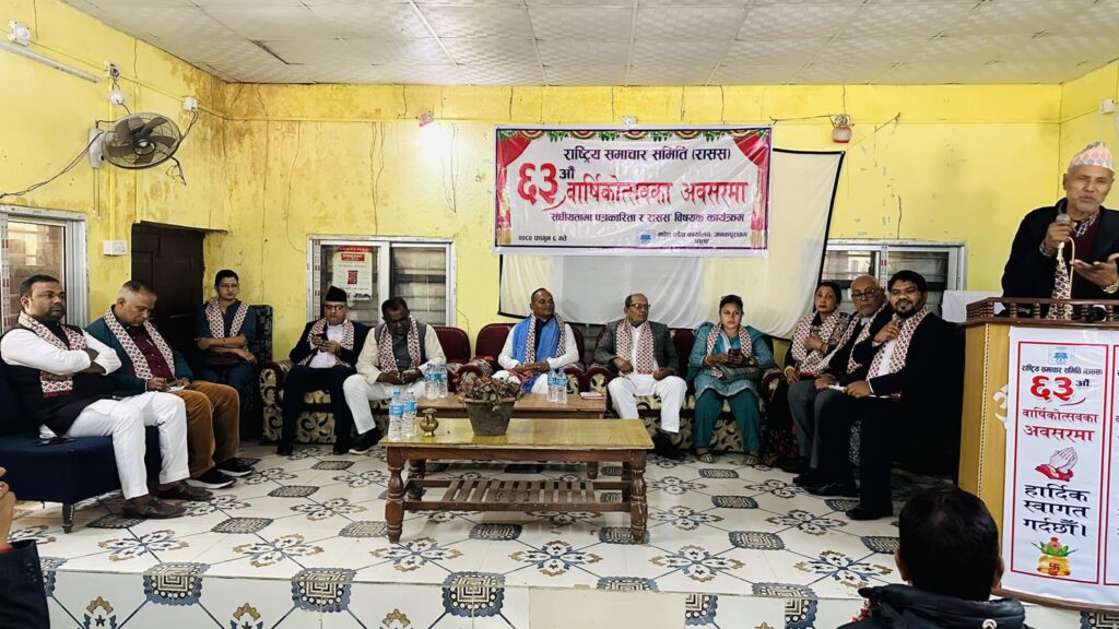 जनकपुरधाम, फागुन ६ : राष्ट्रिय समाचार समिति (रासस) को ६३ औं वार्षिकोत्सव मधेश प्रदेश कार्यालय धनुषाद्वारा समेत एक अन्तरक्रिया कार्यक्रमको आयोजना गरि मनाइएको छ । राससले फाल्गुन ७ गते सोमवारका दिन मनाउने स्थापना दिवस विभिन्न जिल्लाहरुले सप्ताहव्यापी रुपमा कार्यक्रम गरेका छन् । रासस कार्यालय जनकपुरधामले आईतवार आफ्नो जन्मजयन्तीको अवसरमा संघीयतामा पत्रकारिता र रासस विषयक विर्मश कार्यक्रमको आयोजना गरेको हो ।