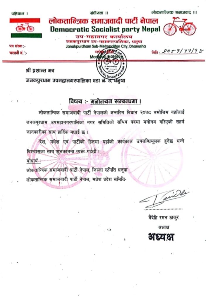 जनकपुरधाम, फागुन १४ : विभिन्न चर्चाका बिच युवा नेता प्रशान्त झा लोसपाकै थप एक जिम्मेवारीमा नियुक्त गरिएका छन् । उनी अन्य पार्टीहरुमा जाने चौकको हल्लाका बिच उनी लोसपामा अडिग रहने भएका छन । उनलाई पार्टीले जनकपुरधामको नगर सचिवमा नियुक्त गरेको छ ।