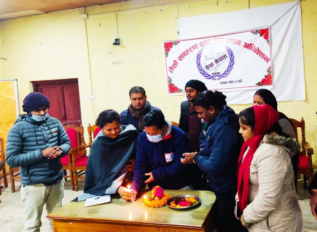 जनकपुरधाम, माघ ३ : सेफ नेपाल धनुषाको तेस्रो साधारण सभा सम्पन्न भएको छ । शनिबार सम्पन्न संस्थाको तेस्रो साधारण सभा तथा प्रथम अधिवेशनमा नीति तथा कार्यक्रम एवं आर्थिक प्रतिवेदन प्रस्तुत गरिएको छ । संस्थाका अध्यक्ष रामप्रमेश मण्डलको अध्यक्षता तथा राष्ट्रिय मानवअधिकार आयोग प्रादेशिक कार्यालय जनकपुरका प्रमुख वीरबहादुर बुढा मगरको प्रमुख आतिथ्यतामा सम्पन्न शनिबार भएको साधारण सभामा नीति तथा कार्यक्रम एवं आर्थिक प्रतिवेदन प्रस्तुत गरिएको हो ।